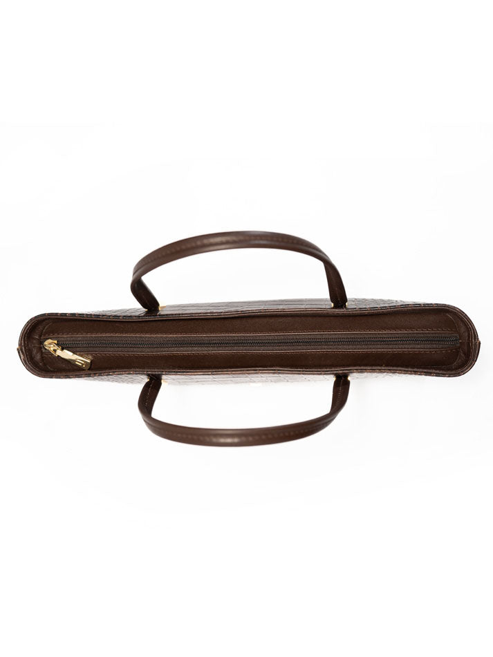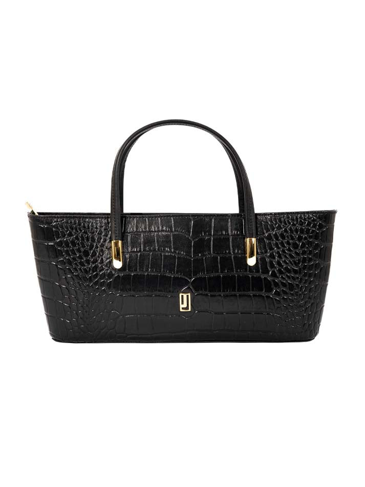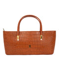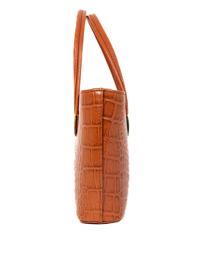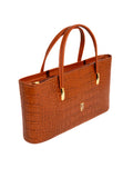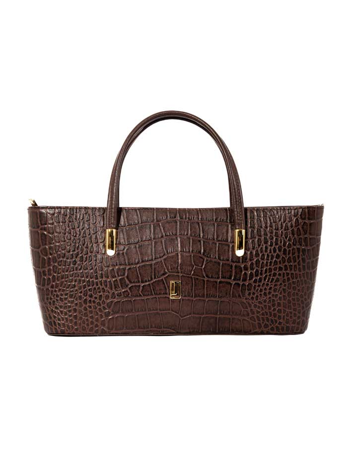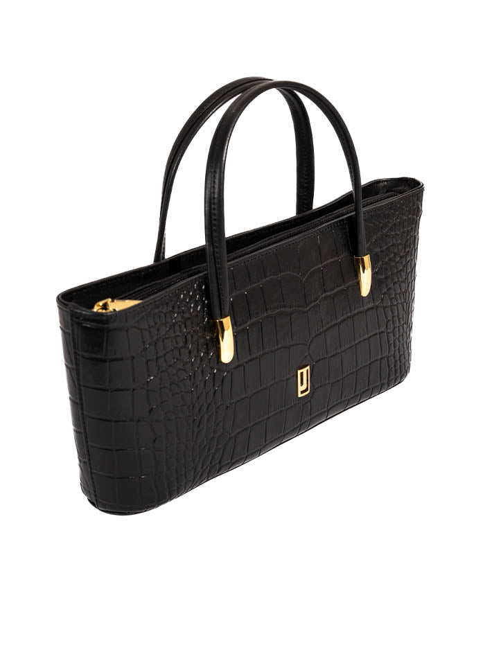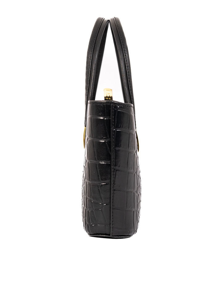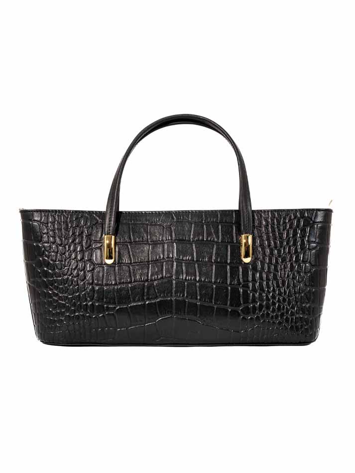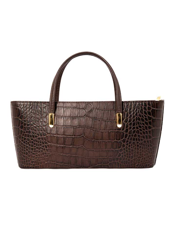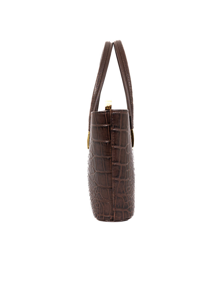 This classic handbag showcases a rich crocodile-embossed texture with gold-tone accents. Its structured shape and double handles make it a refined everyday essential.FEATURES: