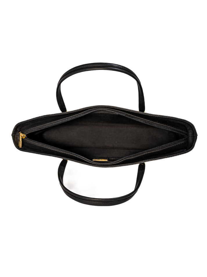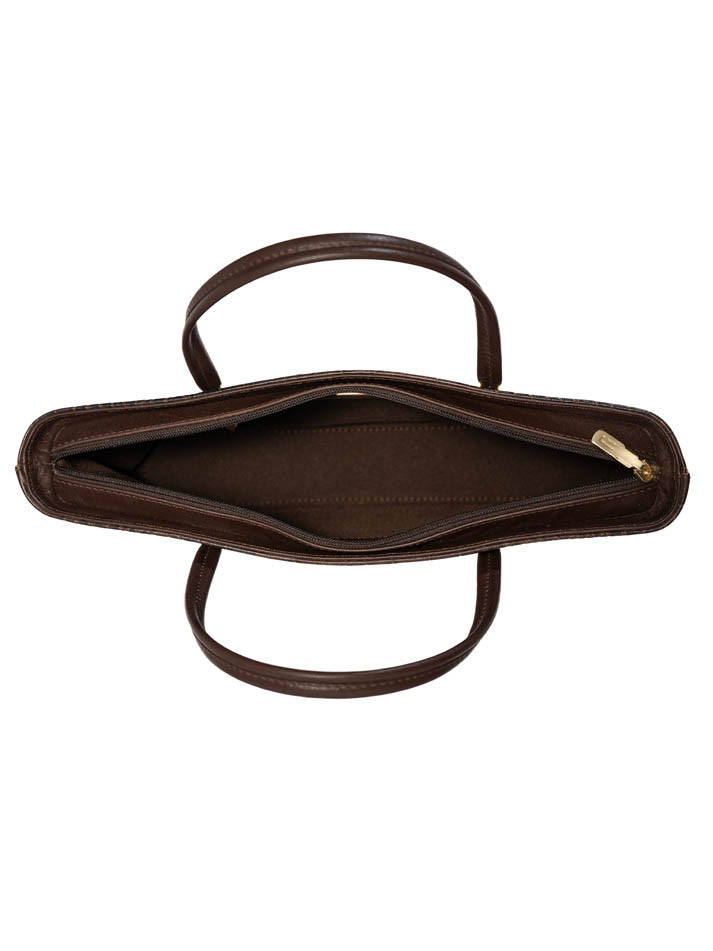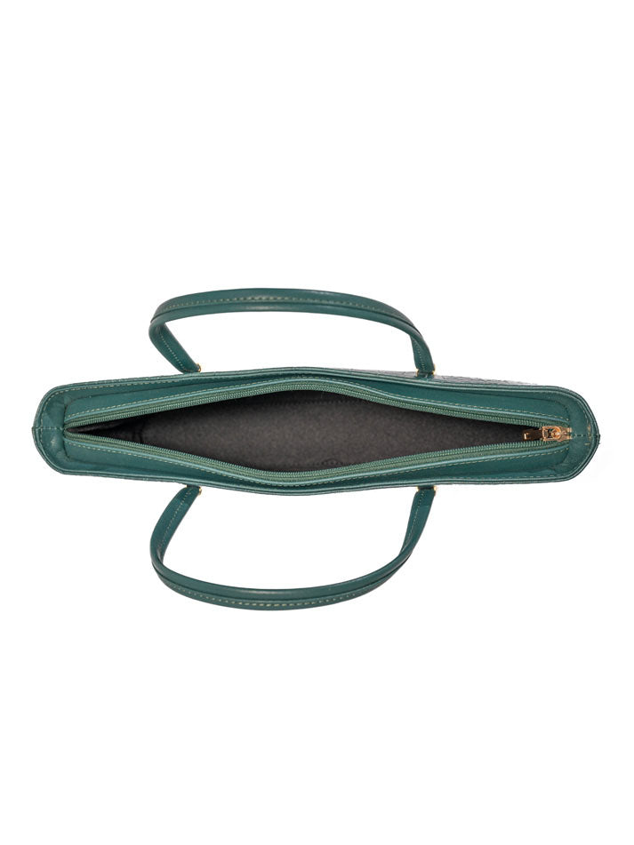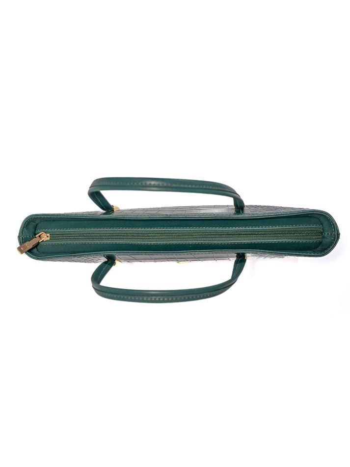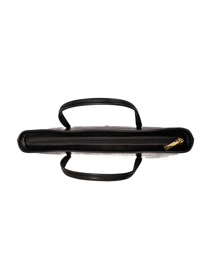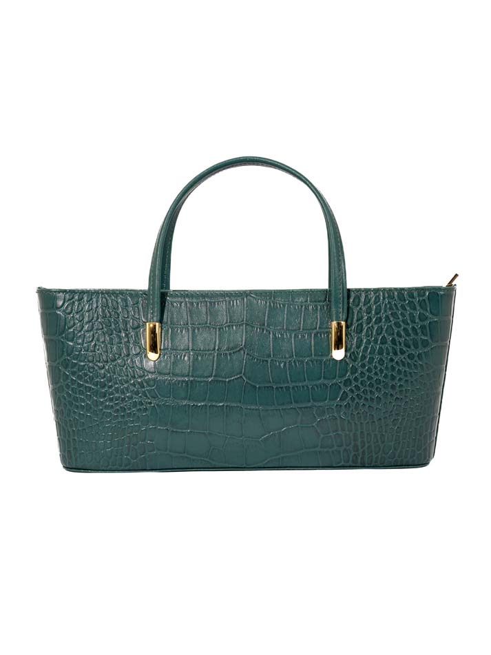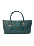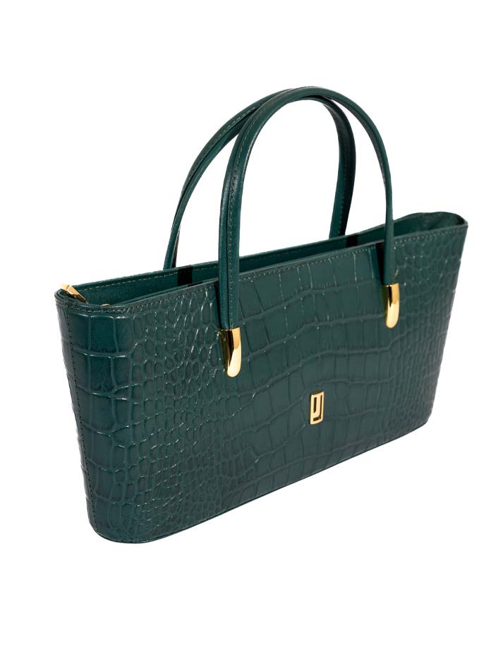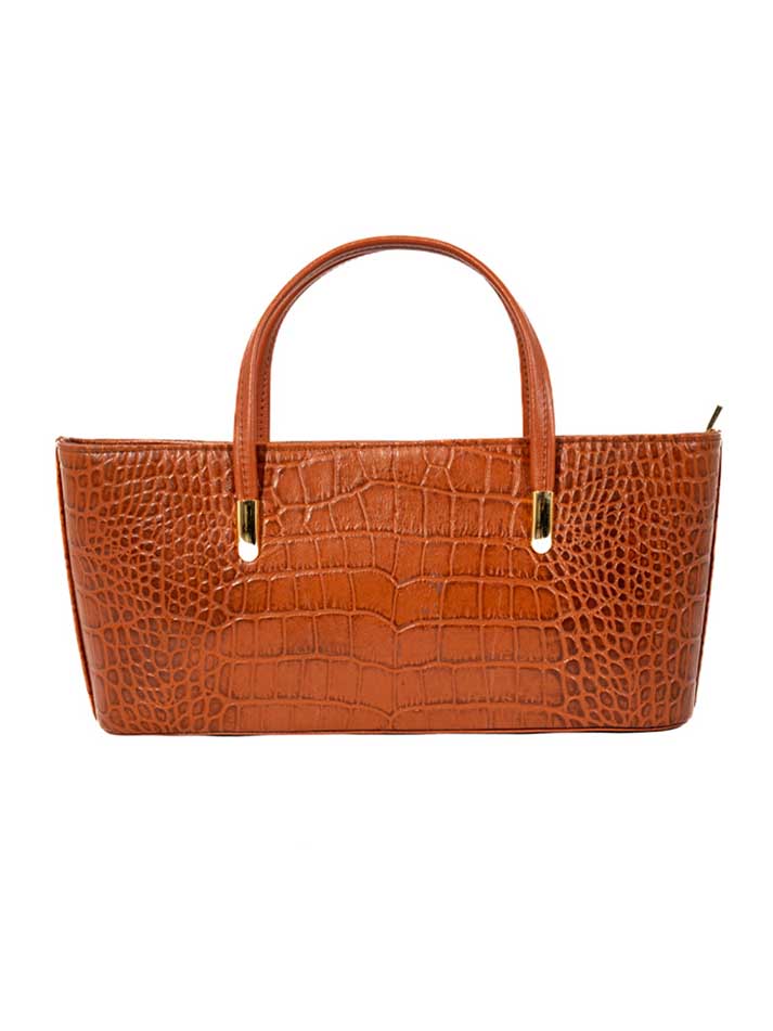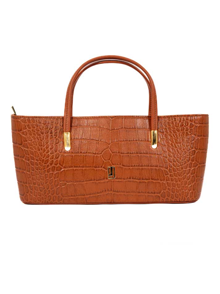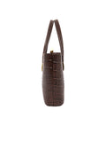 This classic handbag showcases a rich crocodile-embossed texture with gold-tone accents. Its structured shape and double handles make it a refined everyday essential.FEATURES:
